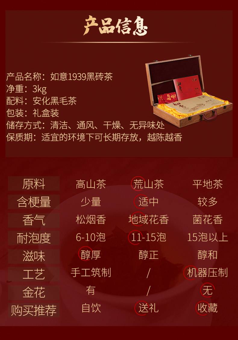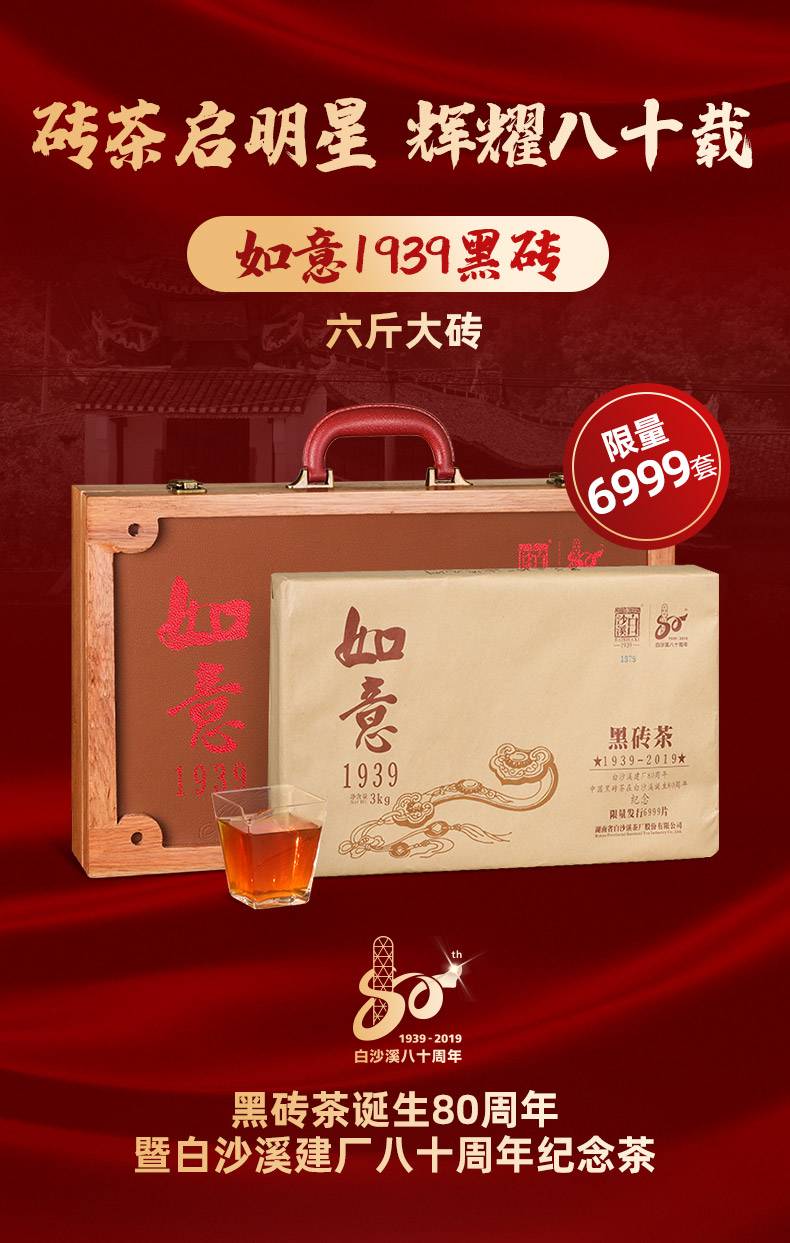白沙溪湖南安化正宗黑茶建80周年限量版黑磚茶如意1939 (3kg)