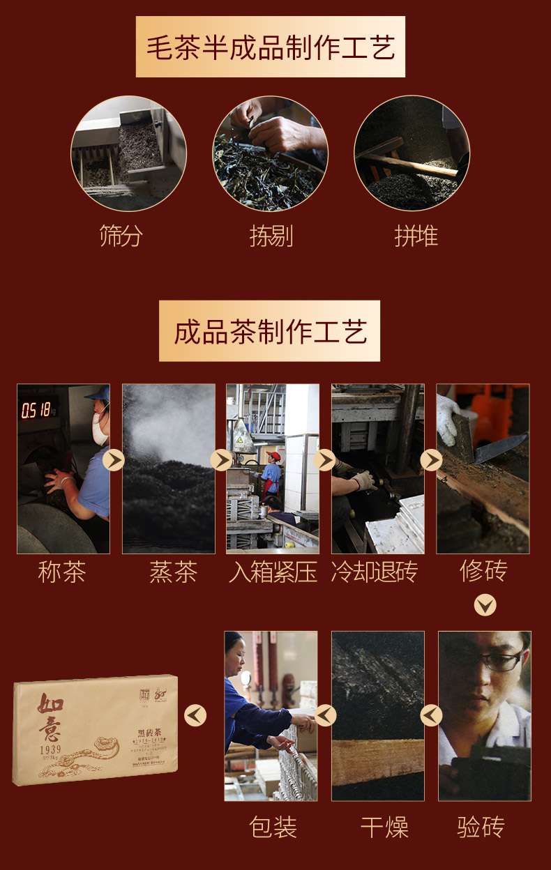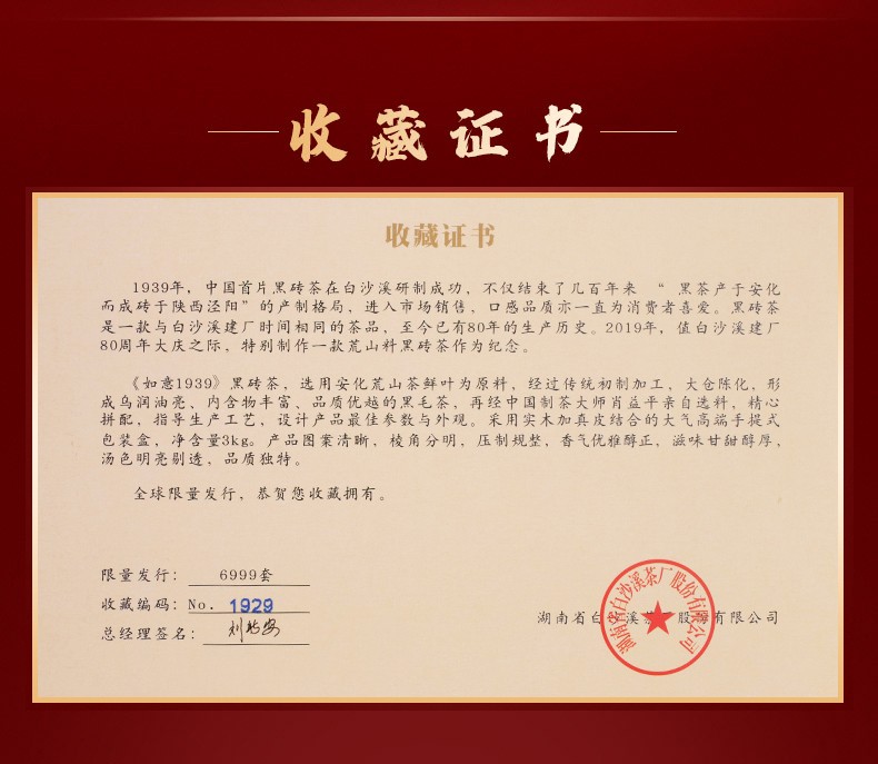 • 白沙溪湖南安化正宗黑茶建80周年限量版黑磚茶如意1939 (3kg)
