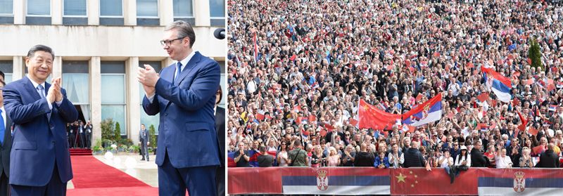 當(dāng)?shù)貢r(shí)間5月8日上午,國(guó)家主席習(xí)近平在貝爾格萊德塞爾維亞大廈同塞爾維亞總統(tǒng)武契奇舉行會(huì)談。會(huì)談前,武契奇陪同習(xí)近平來(lái)到政府大廈平臺(tái)(左圖)。大廈廣場(chǎng)上,一萬(wàn)五千名塞爾維亞民眾揮舞中塞兩國(guó)國(guó)旗,對(duì)習(xí)近平表示最熱烈的歡迎(右圖)。(拼版照片)新華社記者 黃敬文 丁海濤 攝