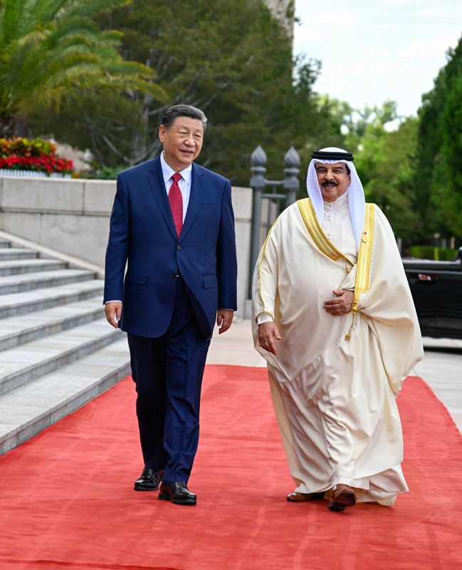 5月31日下午,國家主席習近平在北京人民大會堂同來華國事訪問并出席中阿合作論壇第十屆部長級會議開幕式的巴林國王哈馬德舉行會談。這是會談前,習近平在人民大會堂東門外廣場為哈馬德舉行歡迎儀式。新華社記者 張領(lǐng) 攝