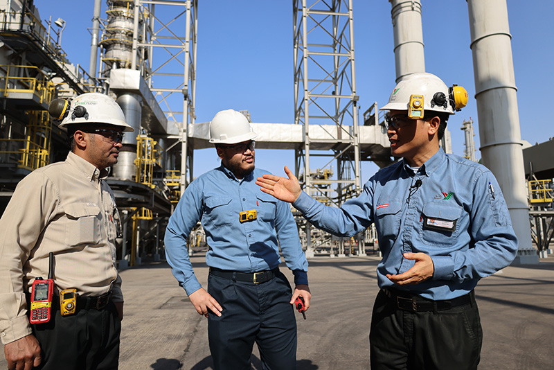 2022年11月27日,在沙特西部城市延布,中沙延布煉廠的員工在交流。新華社記者 王海洲 攝